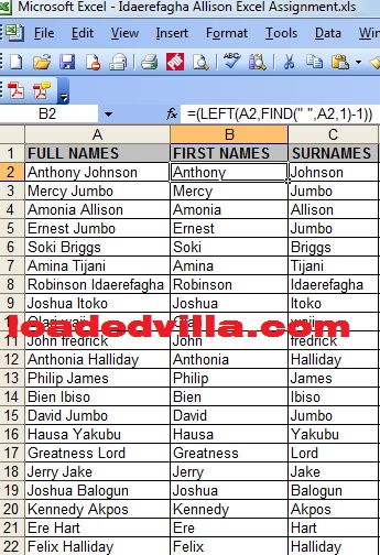 I was given an assignment to type close to 200 names (including First names and Last names) in a single cell. I thought that was all! But the surprising part of this was when the tutor asked me to separate the first names into a different cell and the last name into another cell within 1 minute. That was when I accidentally discovered this little excel function which saved me the stress of doing such all over again.